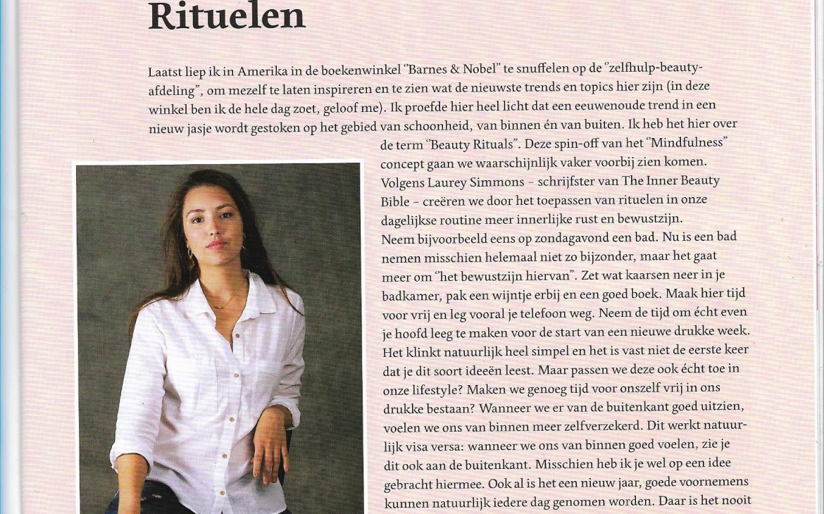 Media Publications column 2: bewust ontspannen door midden van rituelen 2 februari 2018 Nederlands Tijdschrift Voor Huidzorg (NTVH) 0 Like1 min read1296 Views Previous post column 1. Mijn Eerste column Next post Los Angeles Leave a reply Reactie annuleren Save my name, email, and website in this browser for the next time I comment. Vul een antwoord in in cijfers:19 + 9 =